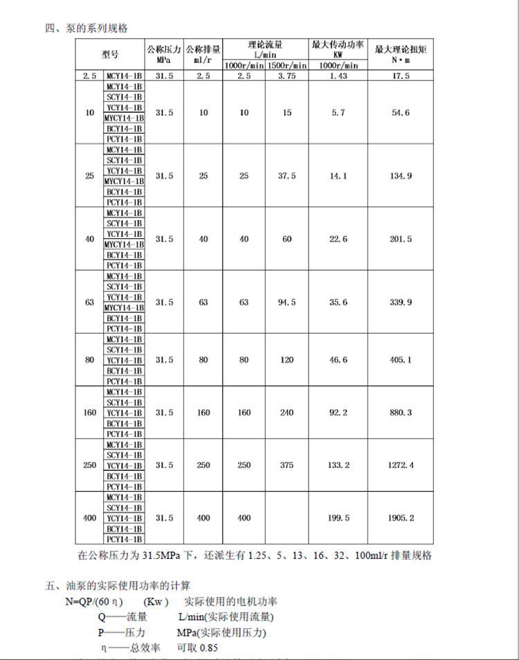 10MCY14-1B定量柱塞泵技術參數如下: