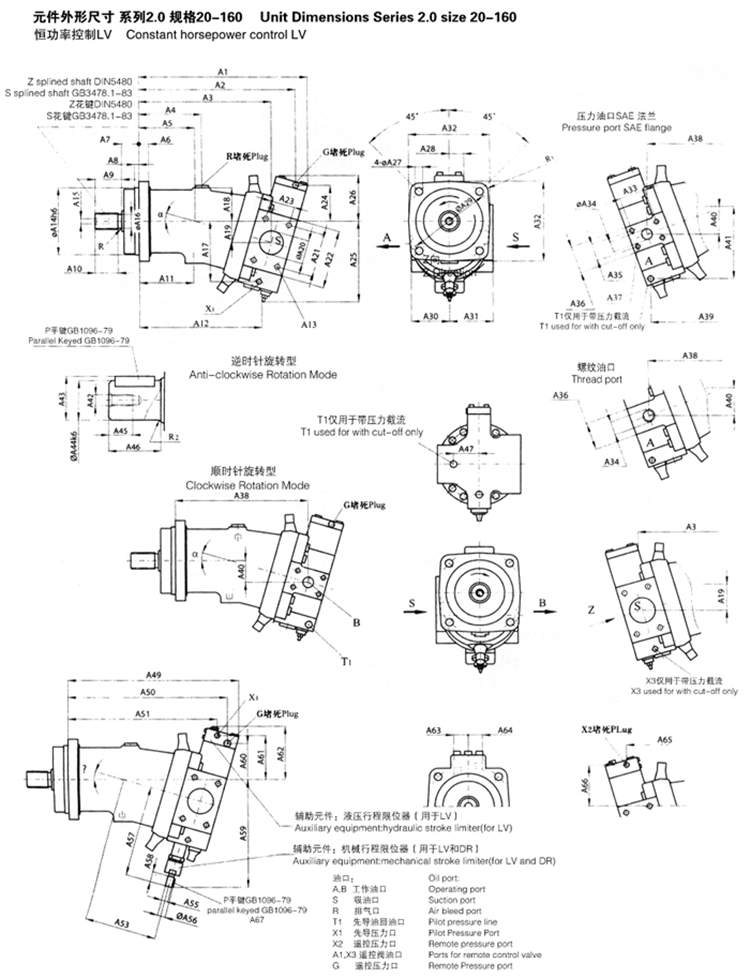 柱塞泵A7V160LV2.0RPF00型號說明:A7V代表產品系列;160代表泵排量,即160ml/r;LV代表控制方式,即恒功率控制;2.0代表系列機構