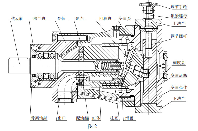 直軸斜盤(pán)式柱塞泵通過(guò)手輪機(jī)構(gòu)改變壓盤(pán)角度,從而改變柱塞與缸體之間的容積,使得控制排量輸出變化,以達(dá)到變量目的。